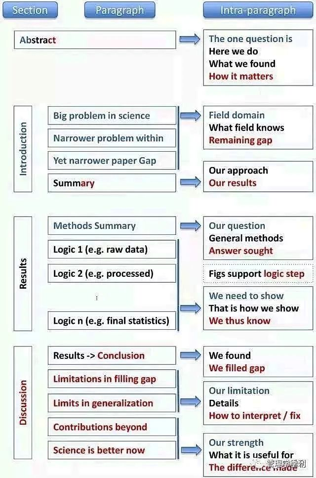 图 1. 论文三个重要部分的结构总结。Note:摘要是其中最特别的,它包含所有三个要素(原因、内容和结论),所以包含了所有三种颜色。