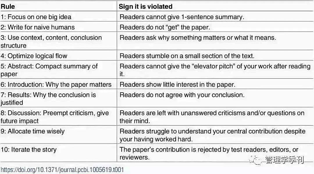 前四条规则可以应用于一篇论文的所有部分,甚至是其他形式的交流,如会谈和海报等。中间四条规则涉及论文每个主要部分的主要目标。最后两条规则为有效构建论文原稿提供了过程启发式的指导。接下来就随我们一起,了解论文写作的奥义。